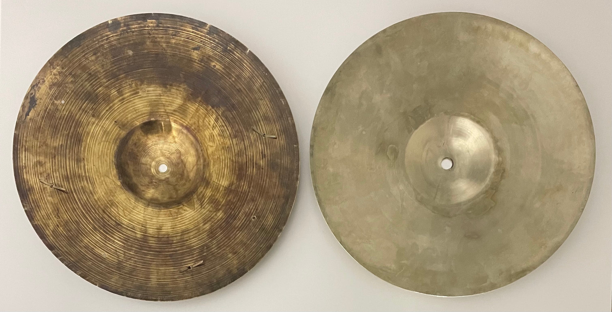 God stand. Top-bækkenet (Paiste Zilko fra 50'erne) har en bule ved kanten og bundbækkenet (Paiste Dixie fra 60'erne) har lidt keyhole. Herudover er bækkenerne i fin stand - der er ingen revner.
